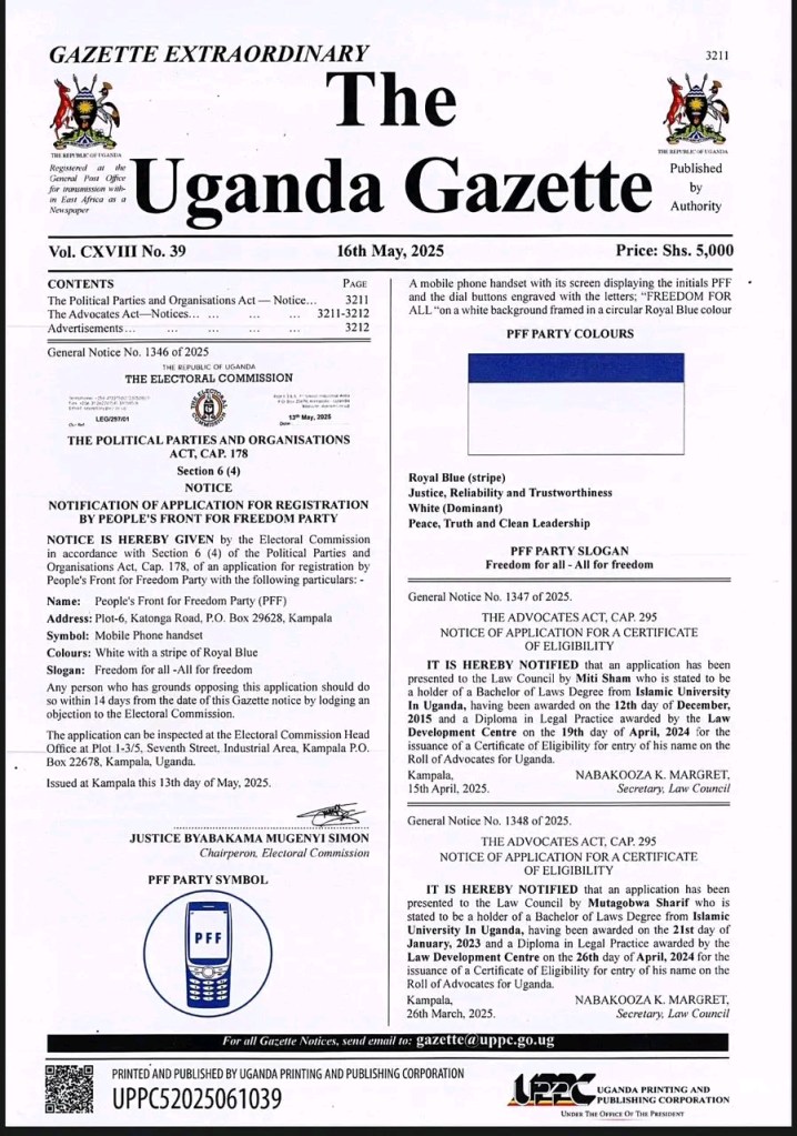 Kampala, Uganda – May 16, 2025 – The Uganda Electoral Commission (EC) has formally gazetted the People’s Front for Freedom (PFF) as a registered political entity, marking a significant development in the country’s political landscape. The announcement, made earlier today, grants the PFF legal recognition to operate as a political party and participate in upcoming electoral processes.